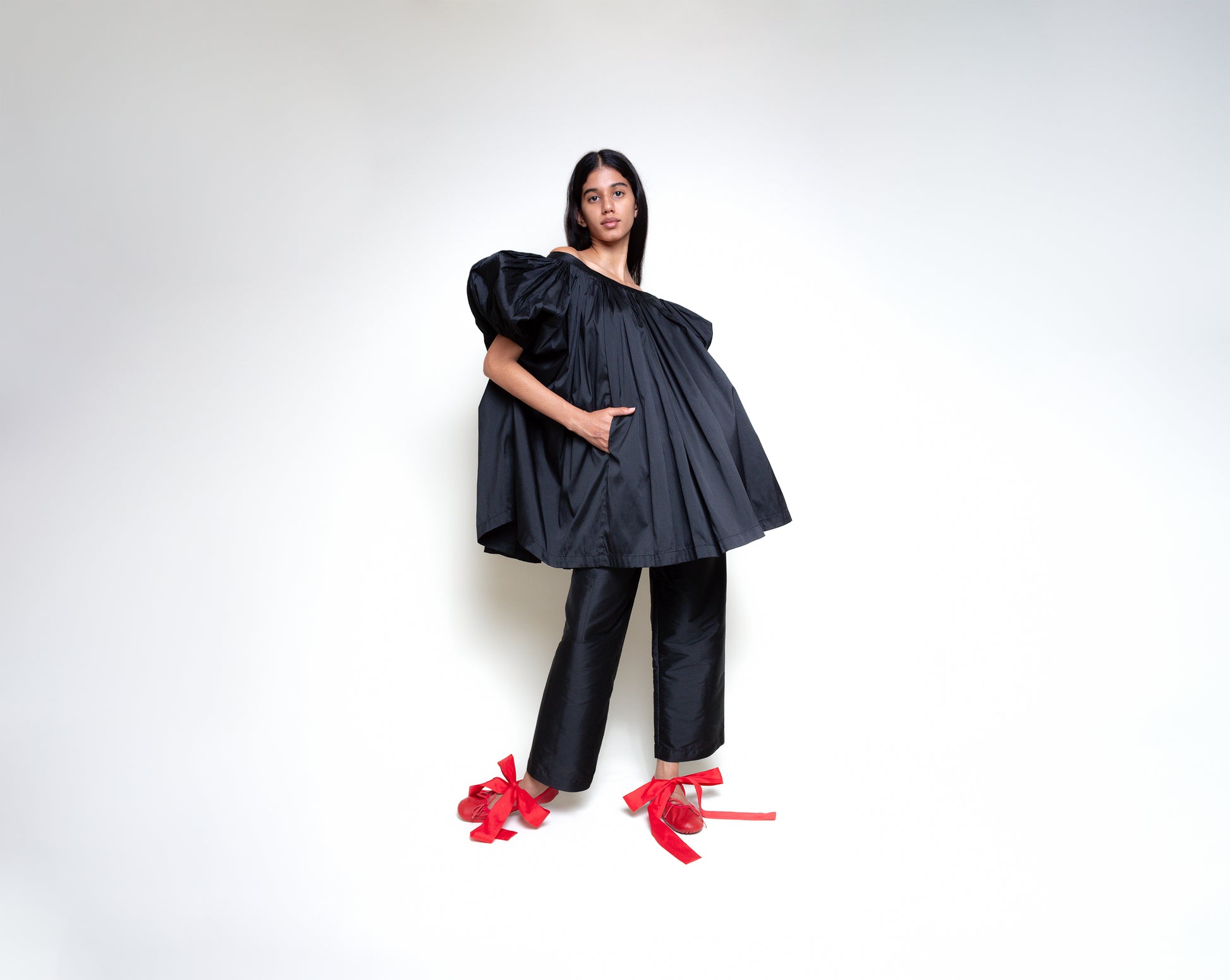 Off the shoulder tafetán tunic with puffy sleeves. It can be worn as pictured or the other way around, as a cover up.