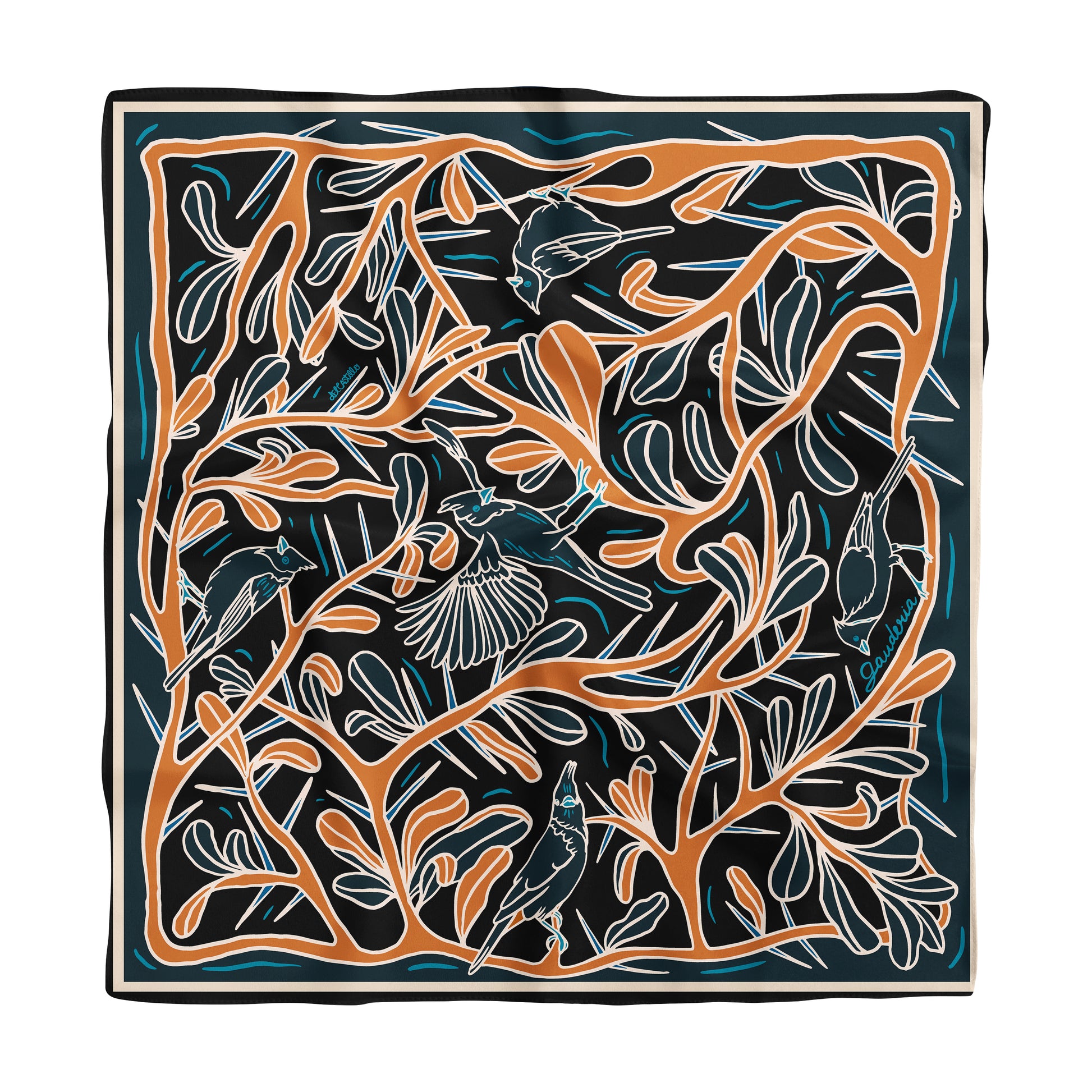 Foulard illustrated by the artist Serrana del Castillo Lussich where cardinals rest in a coronilla tree in Uruguay, finished with a hand-made roulette.