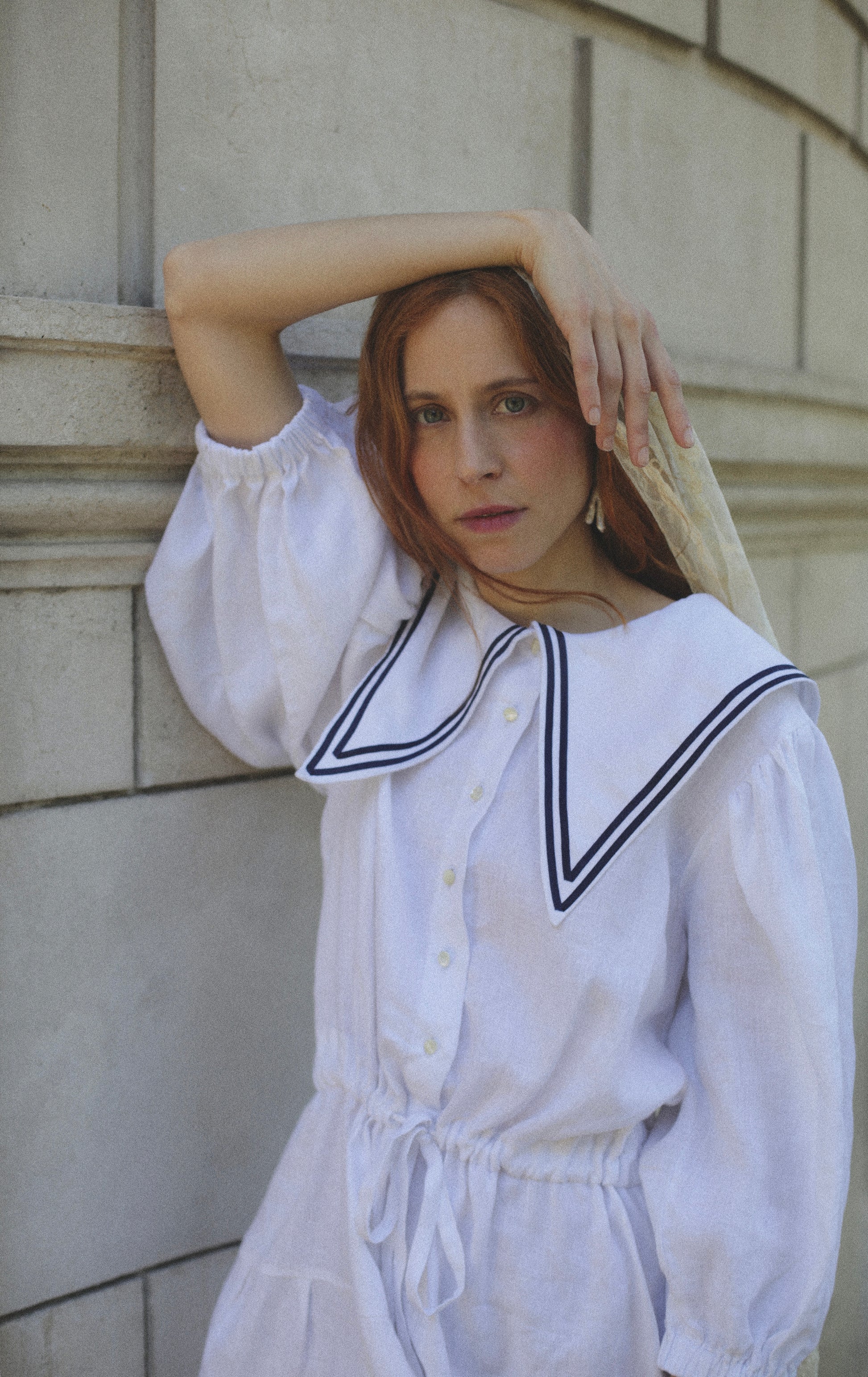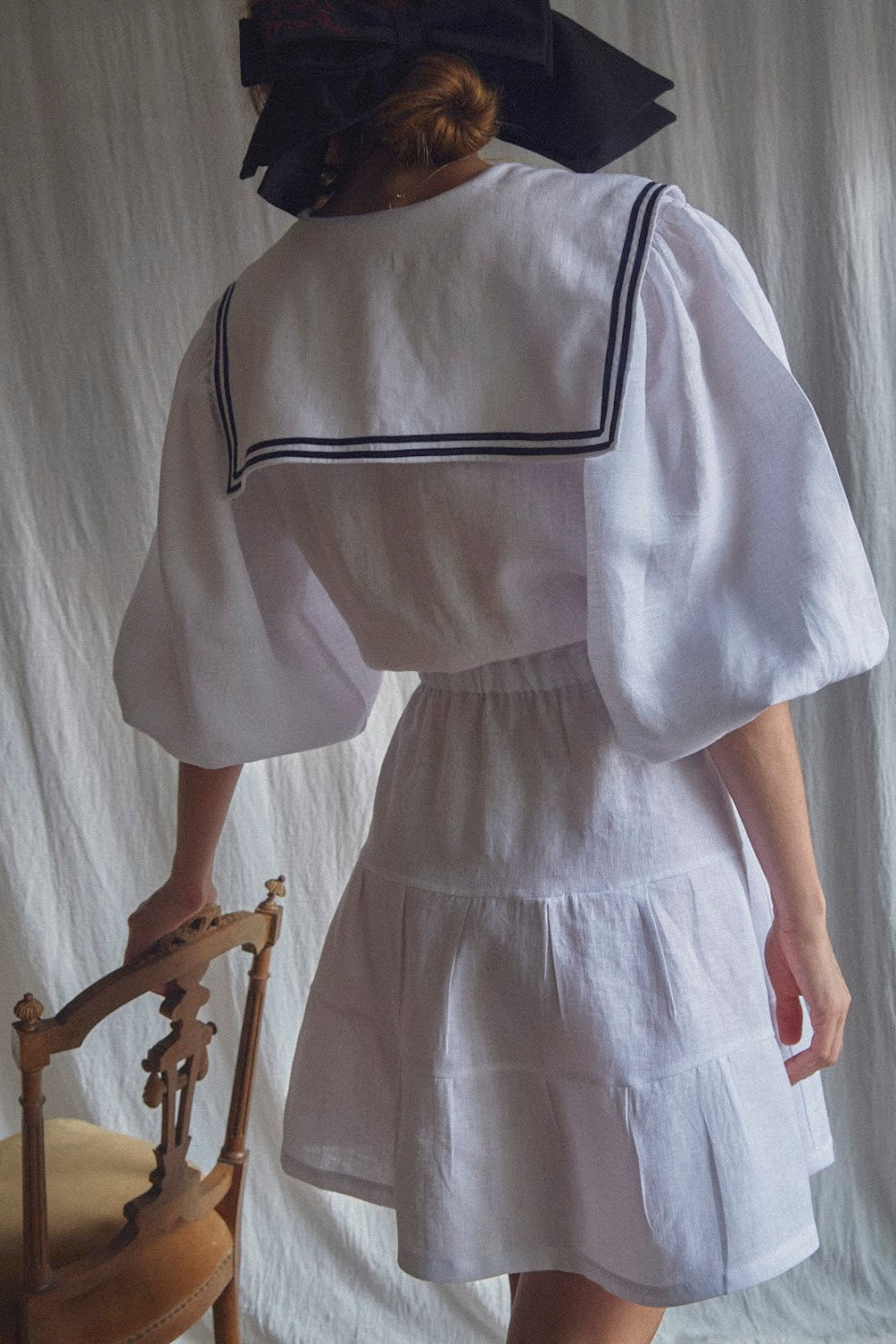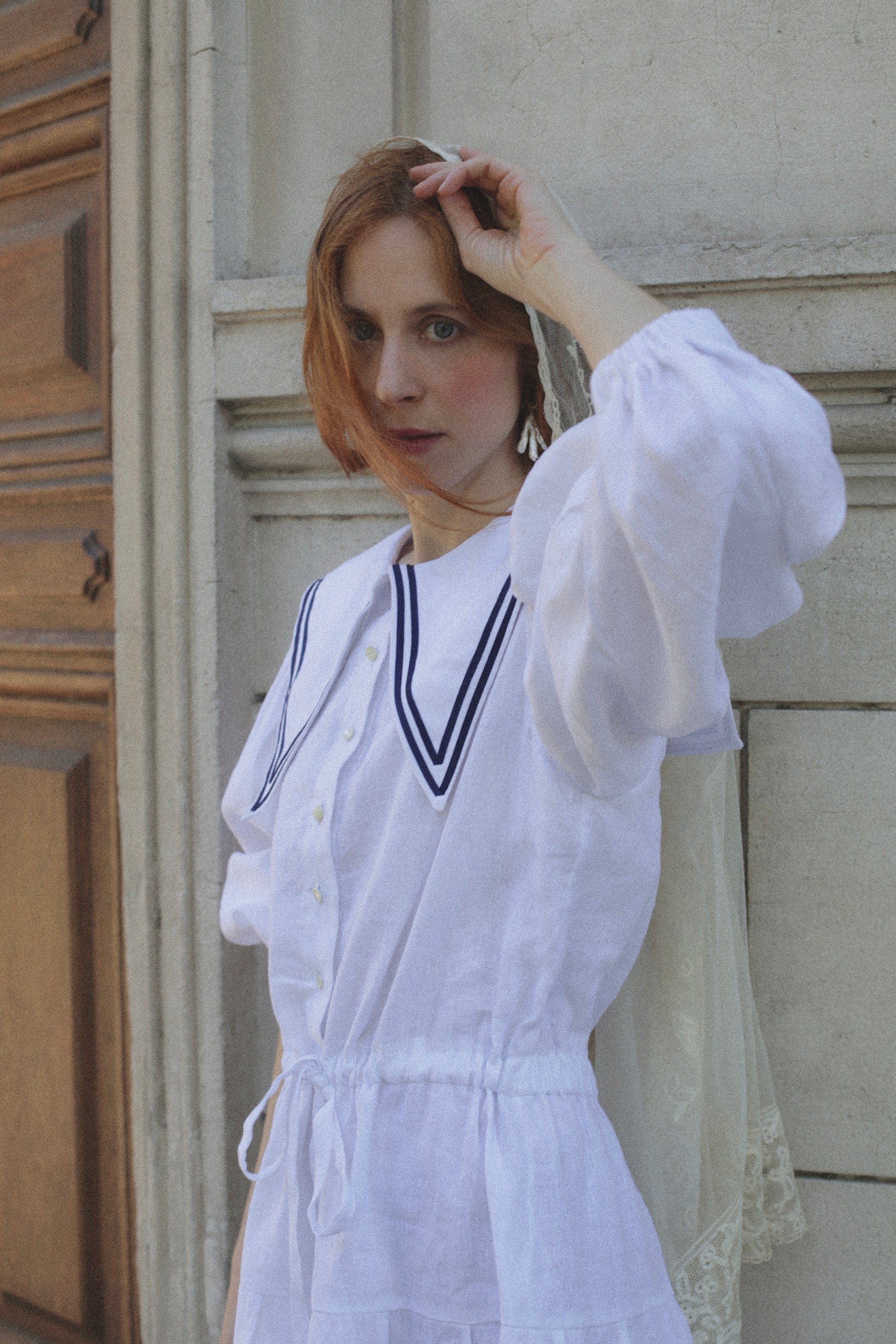 Sailor collar with raw edge. Antique mother-of-pearl buttons, glued by hand. Hand wash in cold water or dry clean.