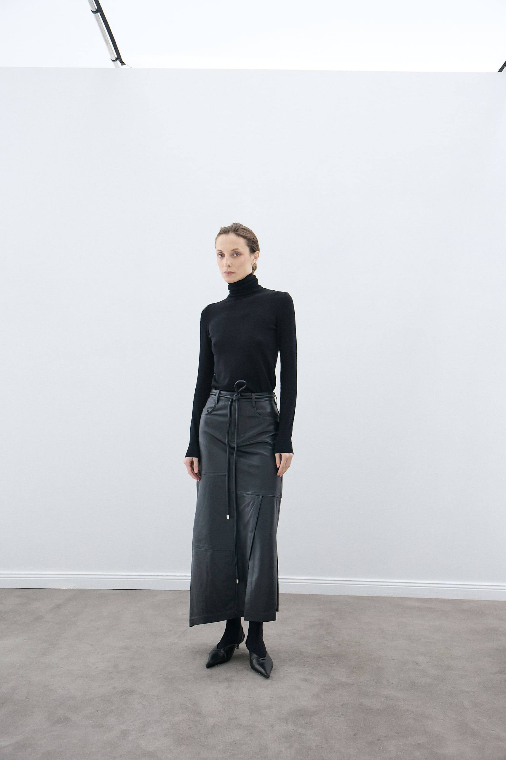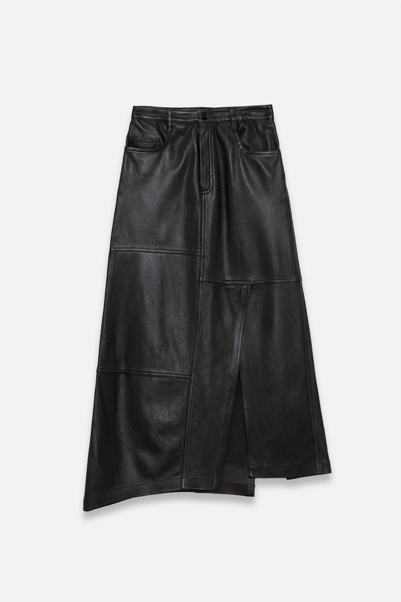 Our Escobar maxi skirt is made from 100% Italian sheepskin. It features an irregular cut, front zipper access, five jean pockets and patchwork cutouts.