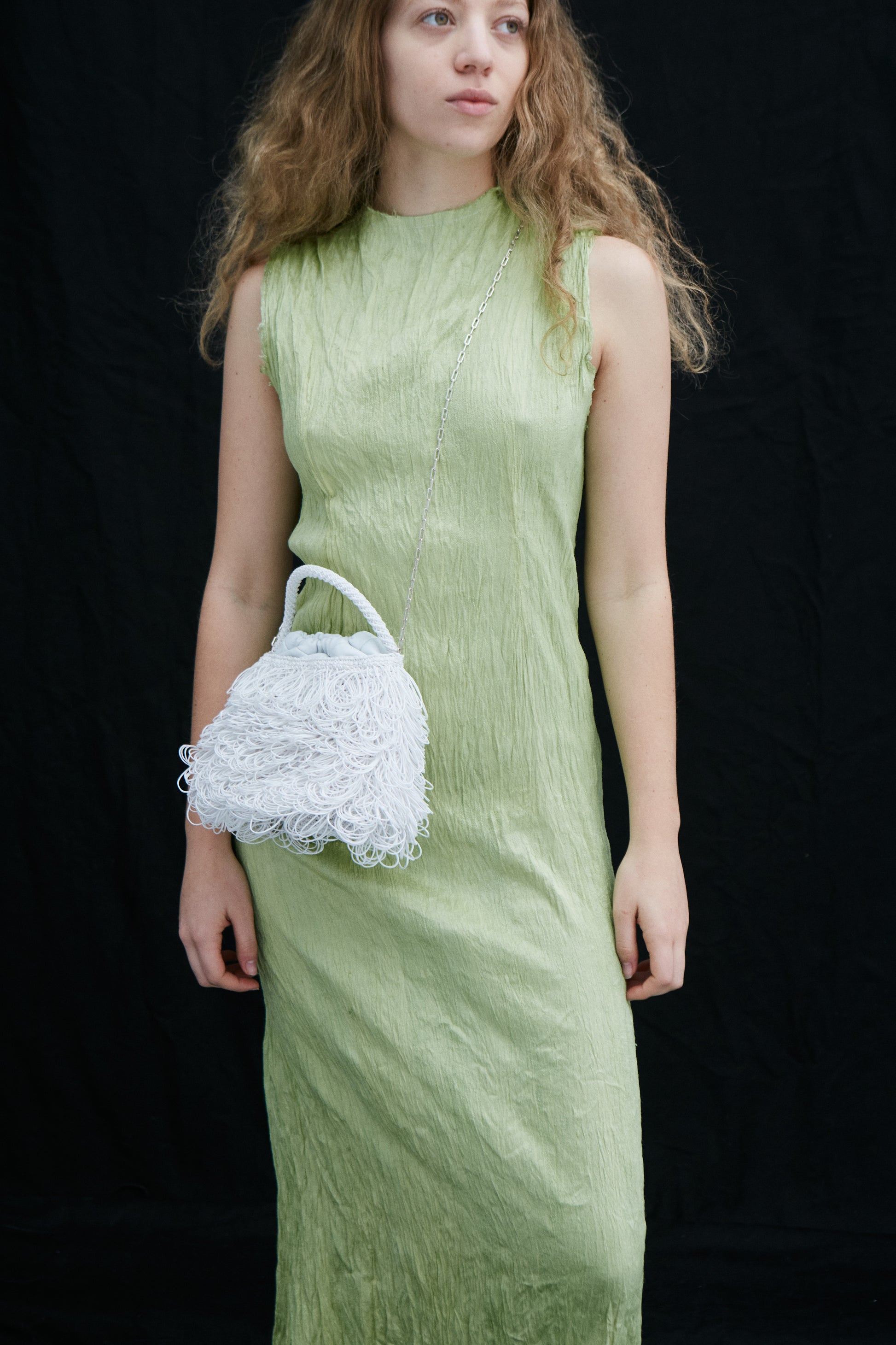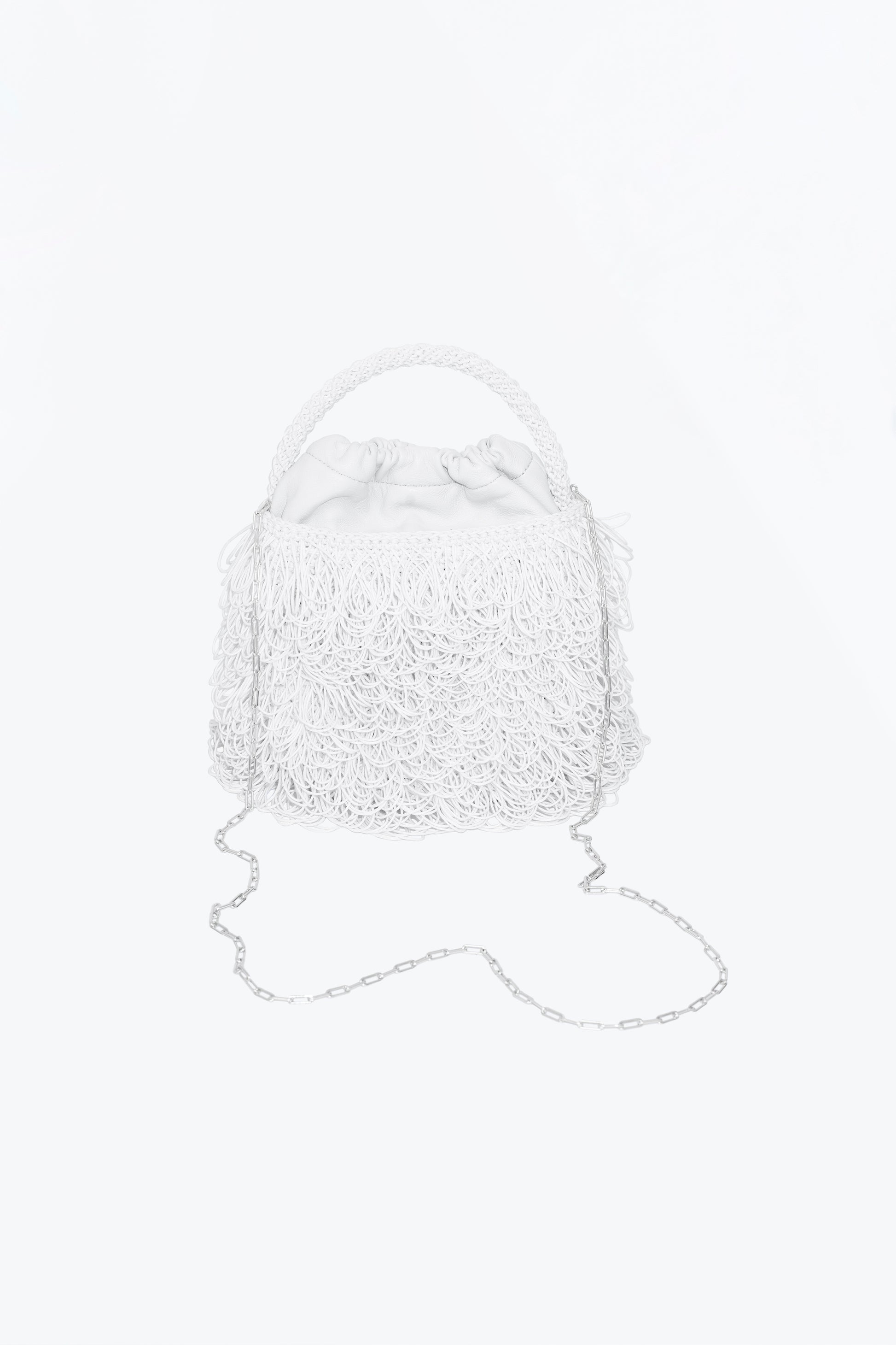 Hand-woven waxed cotton thread and sheepskin bag. Closes with a magnet clasp. Has cotton lining, inner pocket, and silver plated metal chain strap.