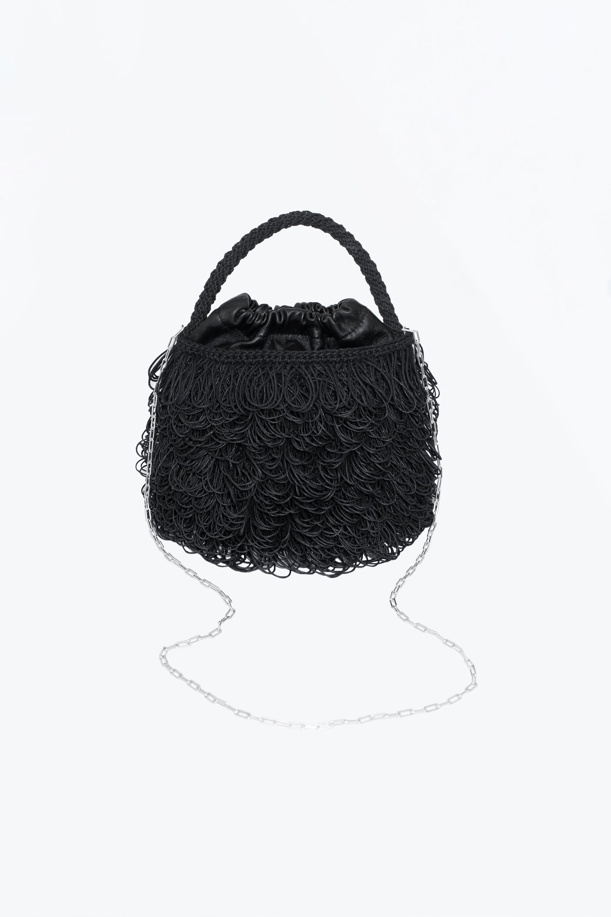 Hand-woven waxed cotton thread and sheepskin bag. Closes with a magnet clasp. Has cotton lining, inner pocket, and silver plated metal chain strap.