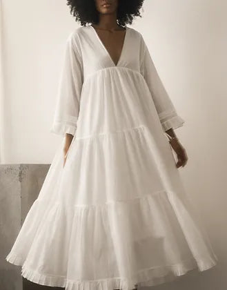 The evostid dress, from the on lightness capsule, is a full length, flowy dress with pleats on the hem. It features a low V-neckline, dropped shoulders and wide sleeves. Its sleeves are detailed with a gathering fabric tie and pleats.