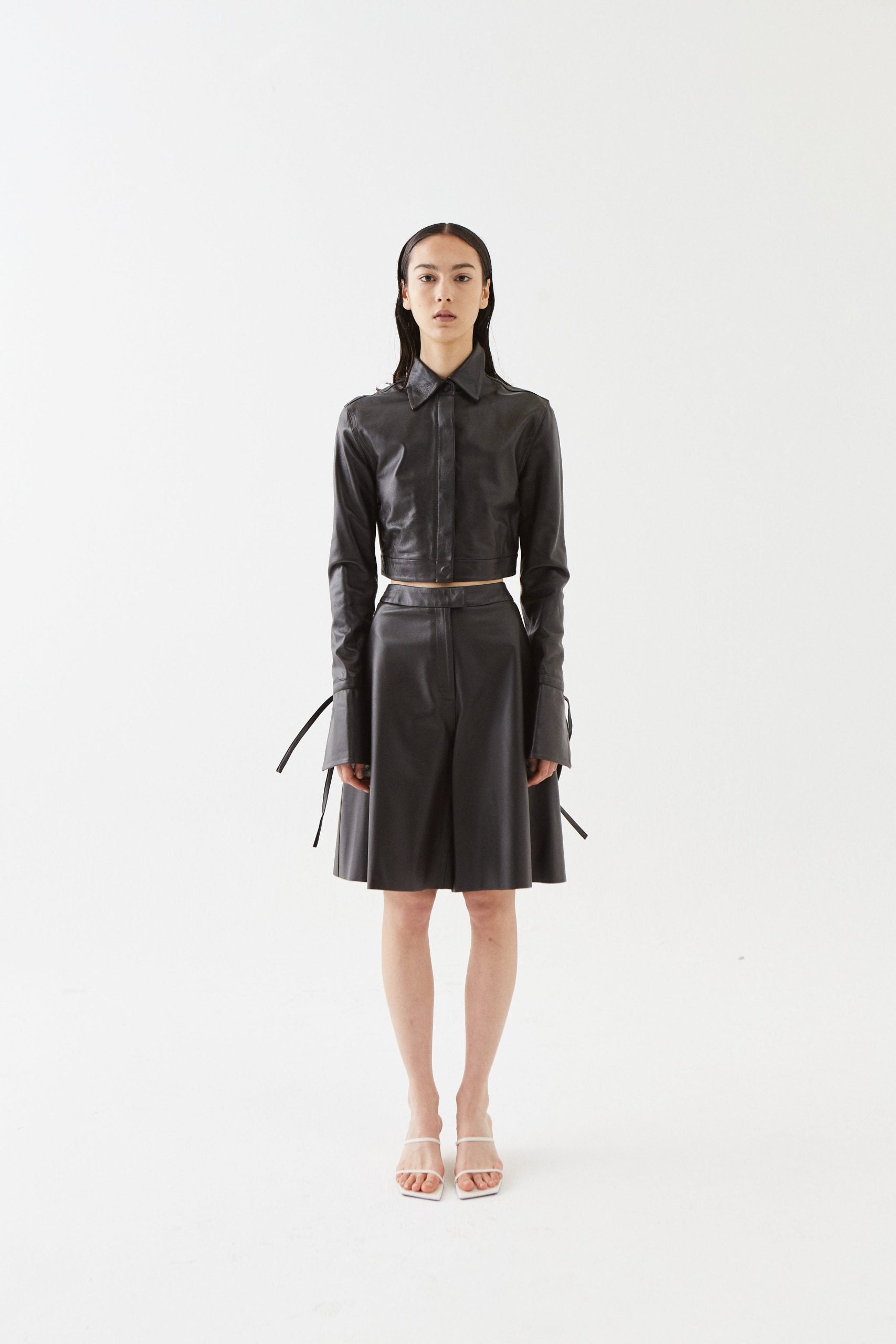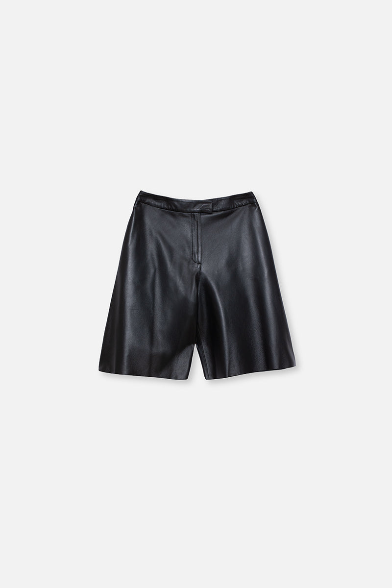 Knee-length, slightly flared and made from sheepskin. It has an elastic waist at the back and in-seam pockets.