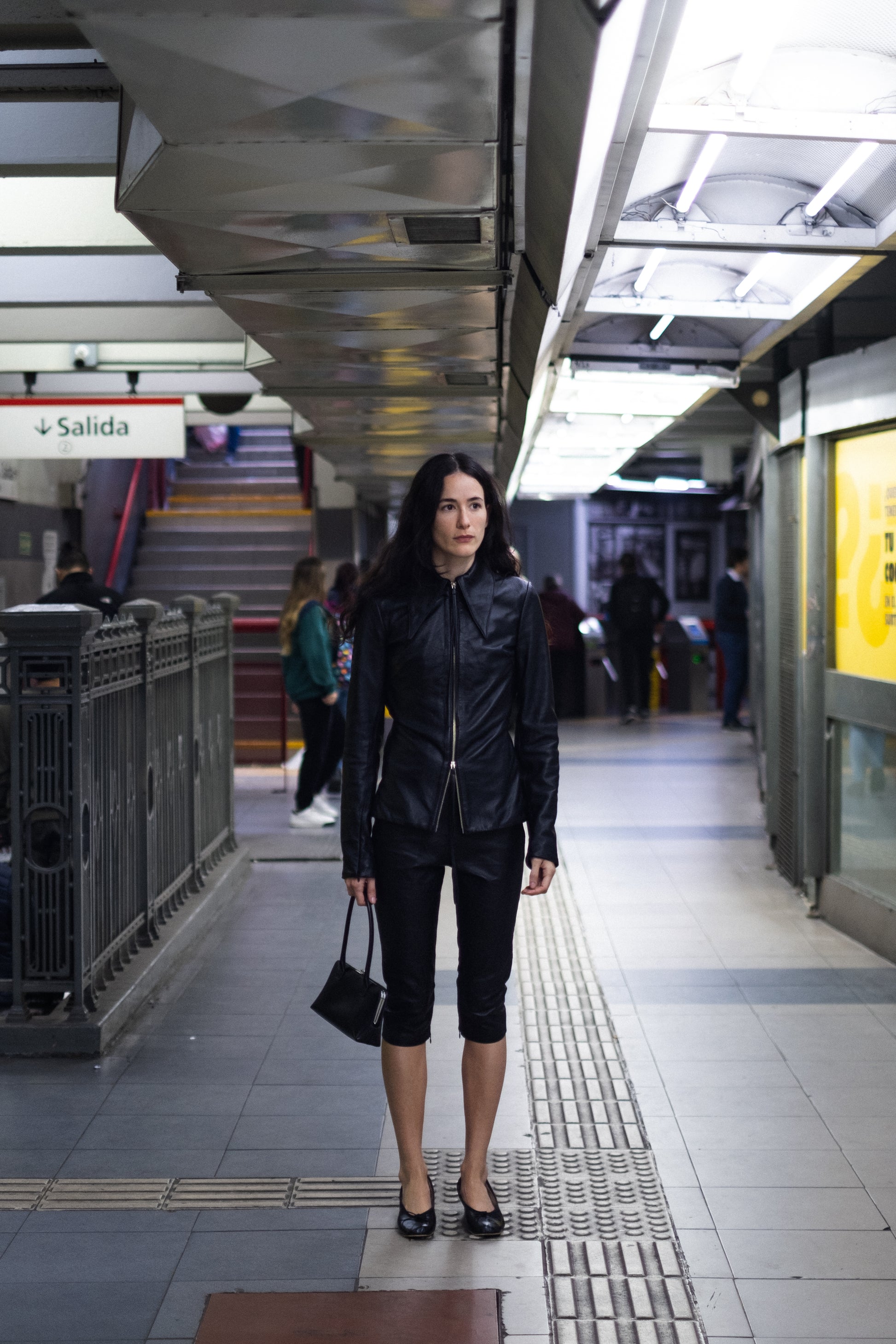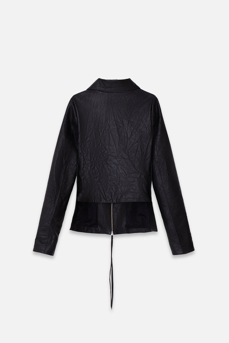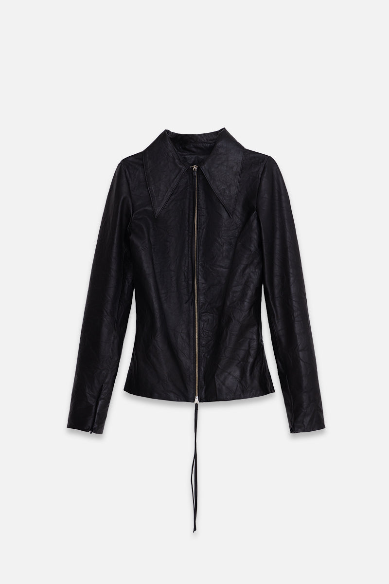 Slim-fitting shirt made of cracked sheepskin. Two-way closure at central access, with prominent shirt collar, irregular length at front and back.