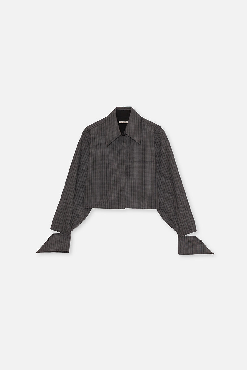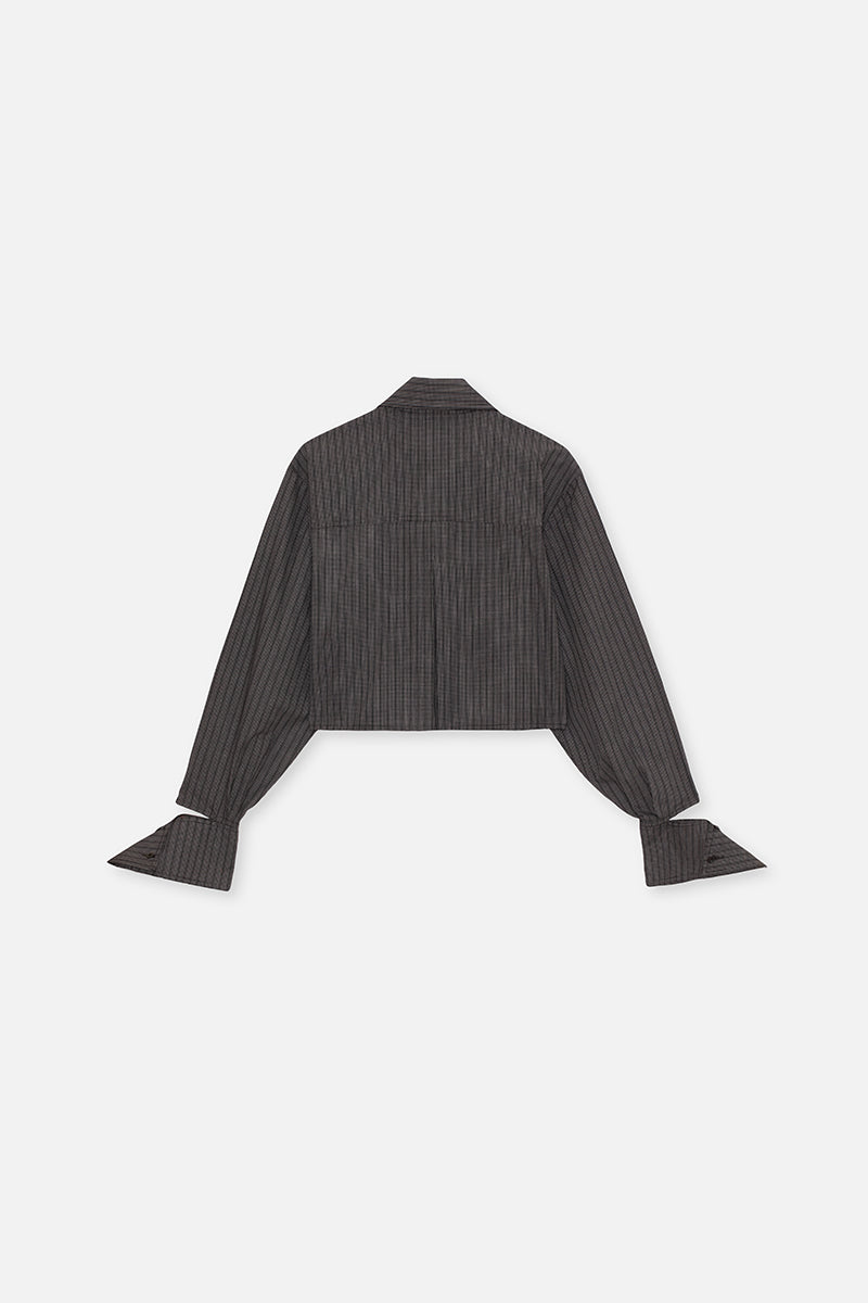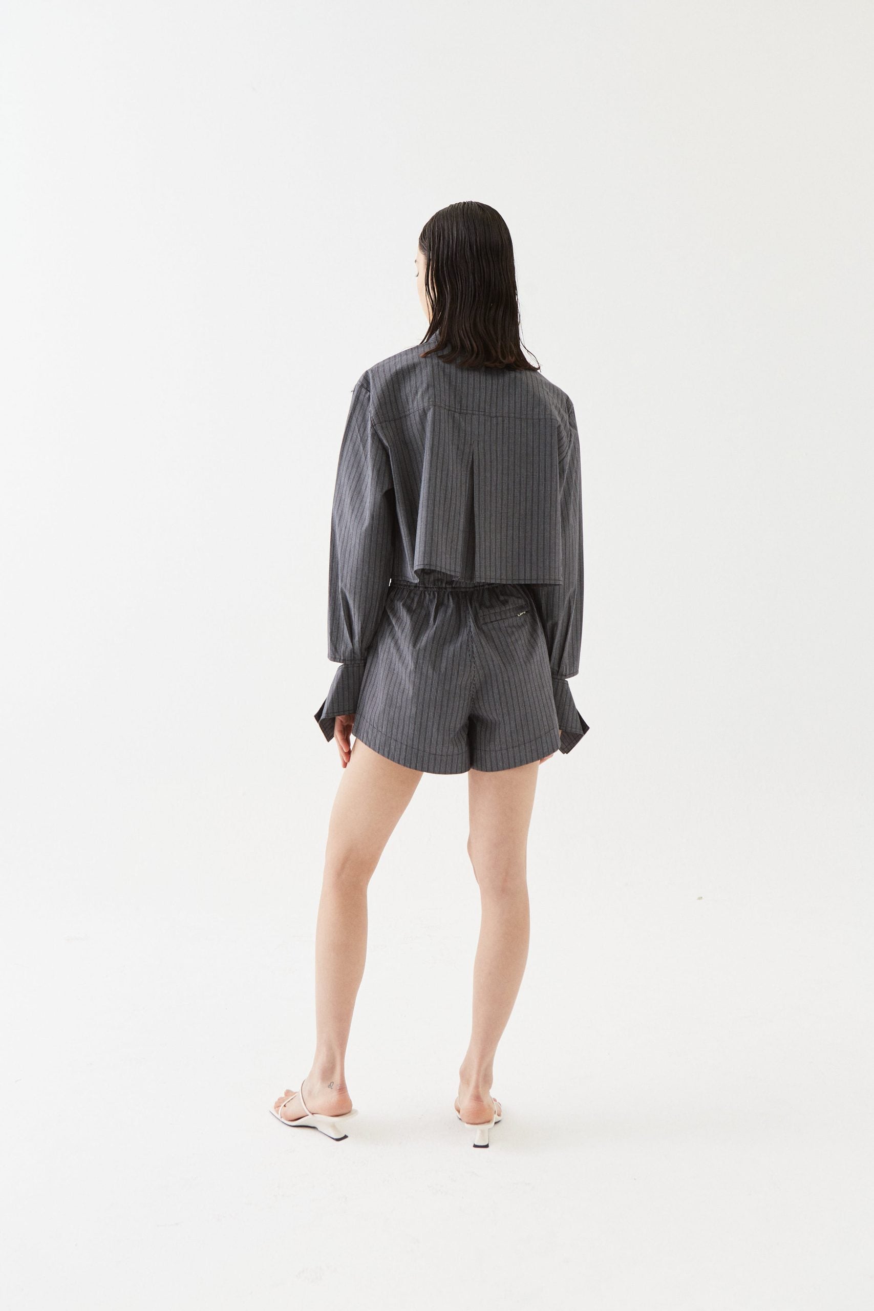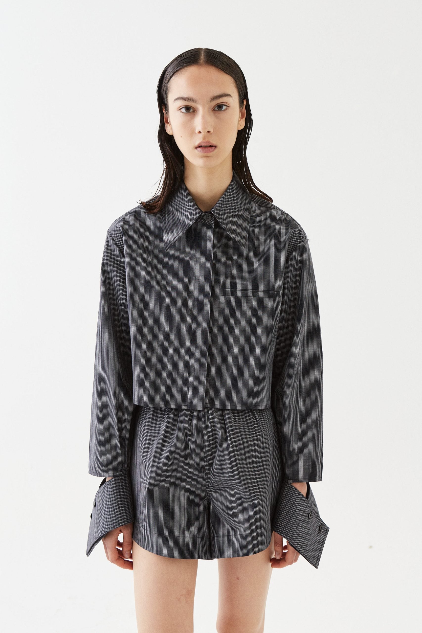 Short, loose silhouette with a pointed collar, dropped shoulders, concealed buttons and cuff detailing