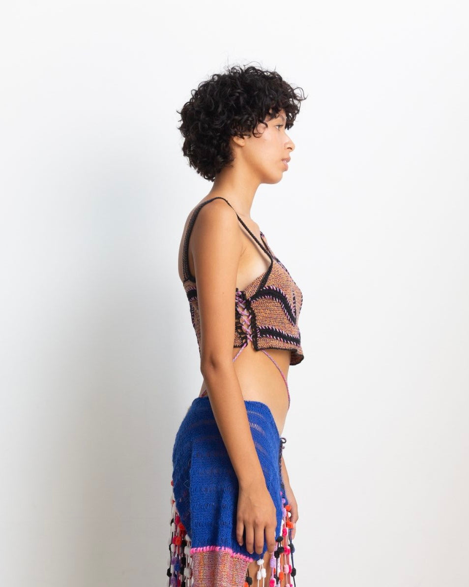 Hand knitted crochet top with hand embroidery interventions. Unique piece.