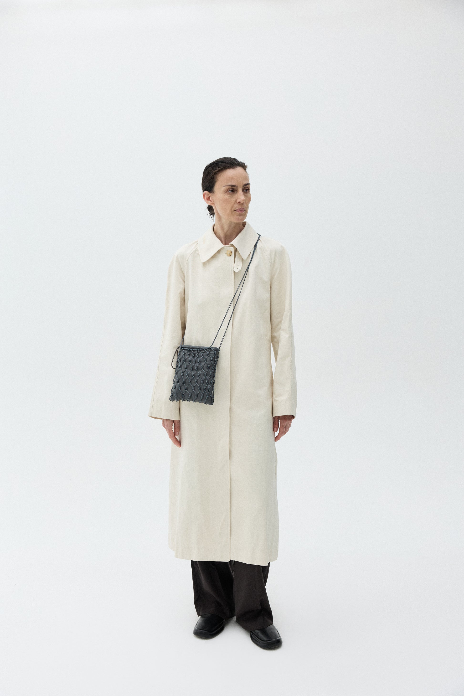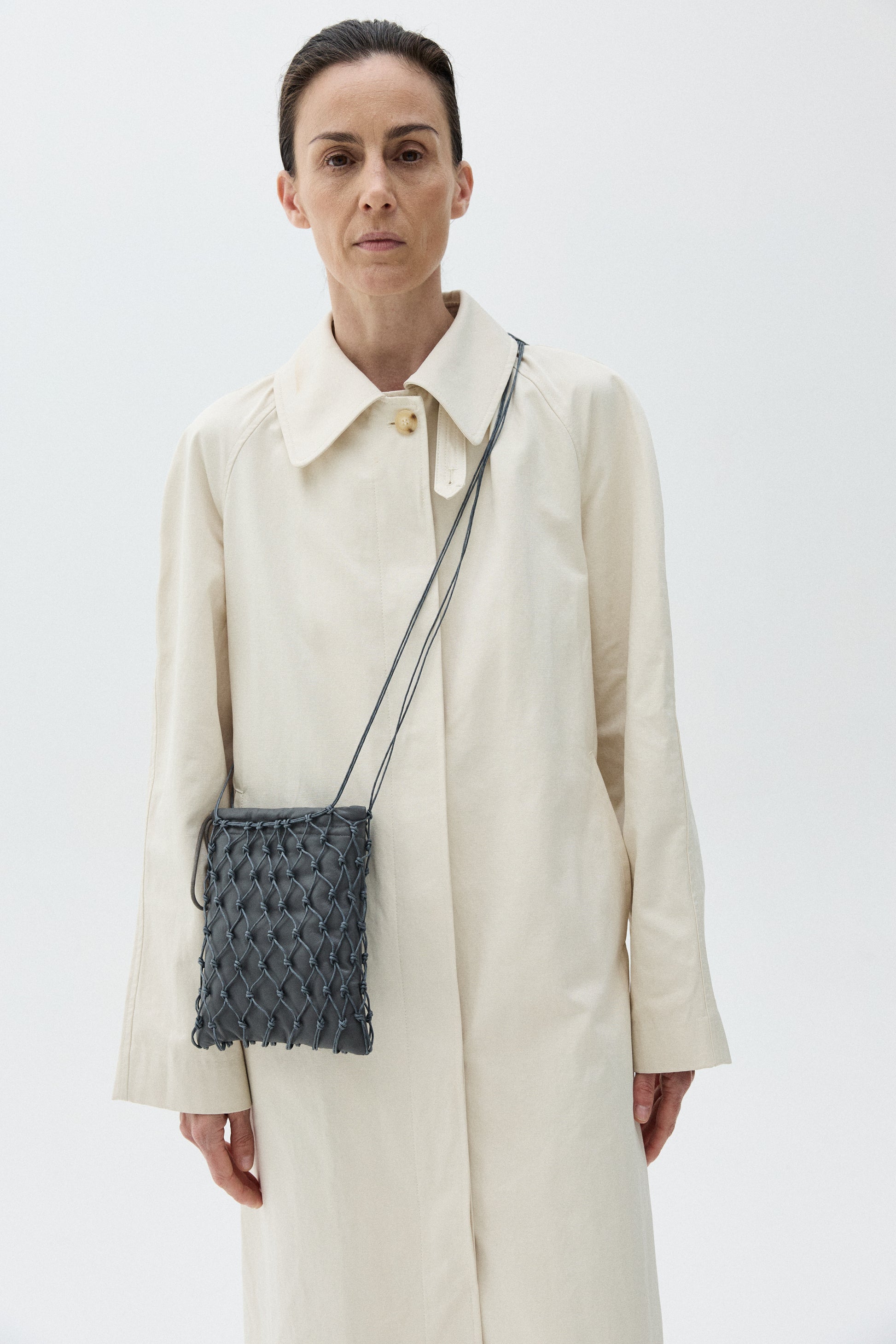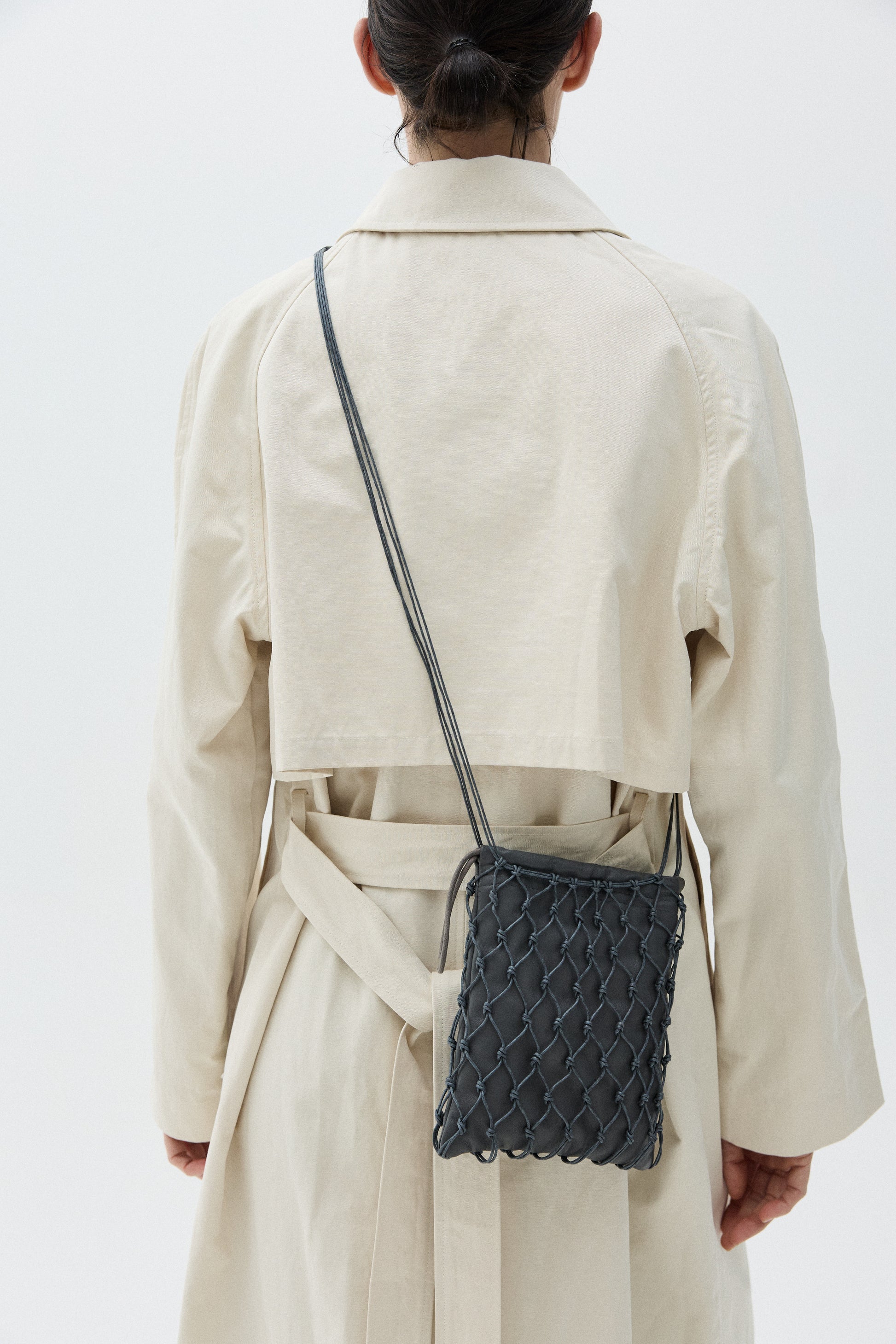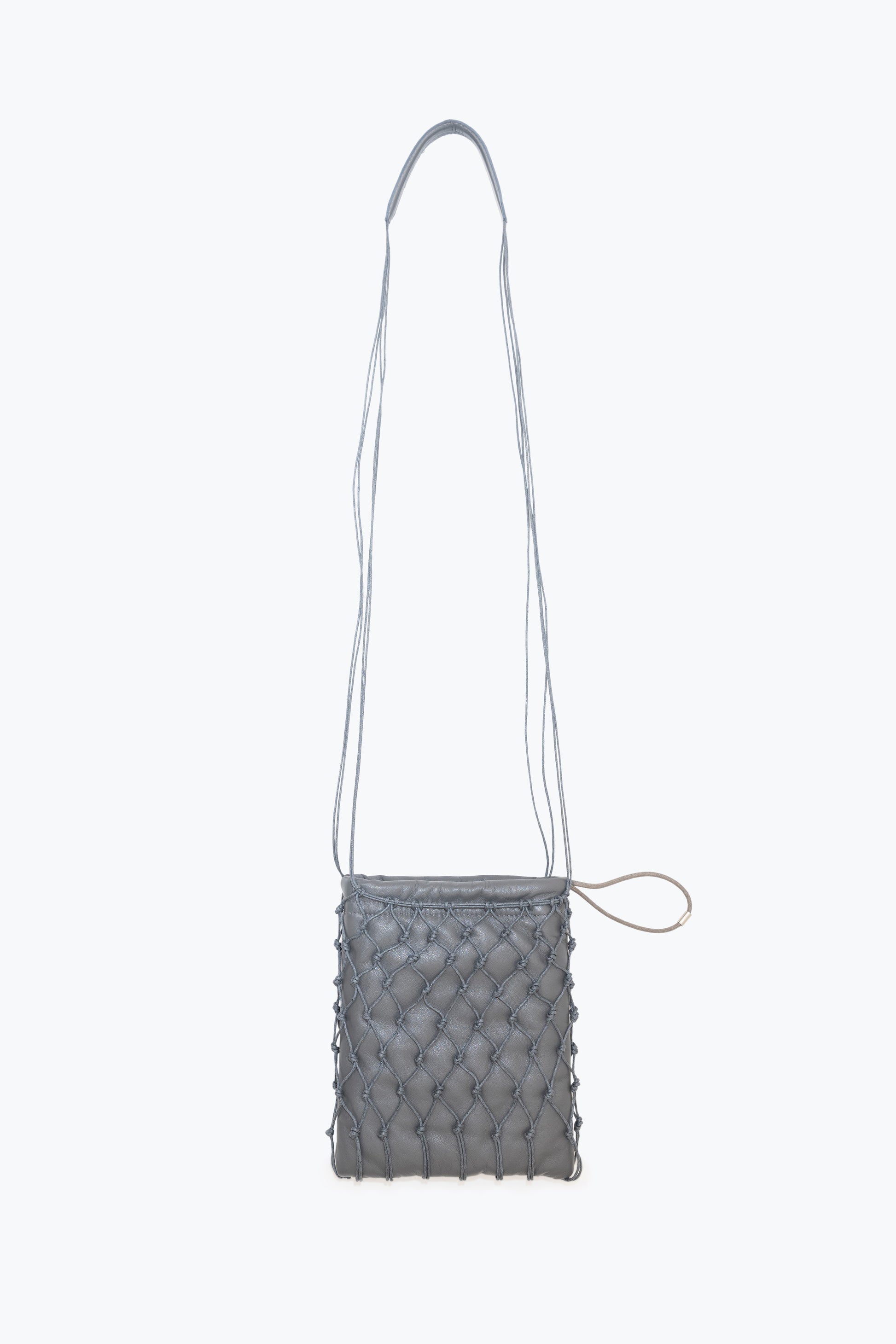 Hand-knotted net in cotton cord with soft lambskin pocket and drawstring closure. It has cotton crossbody straps and pure cotton lining.