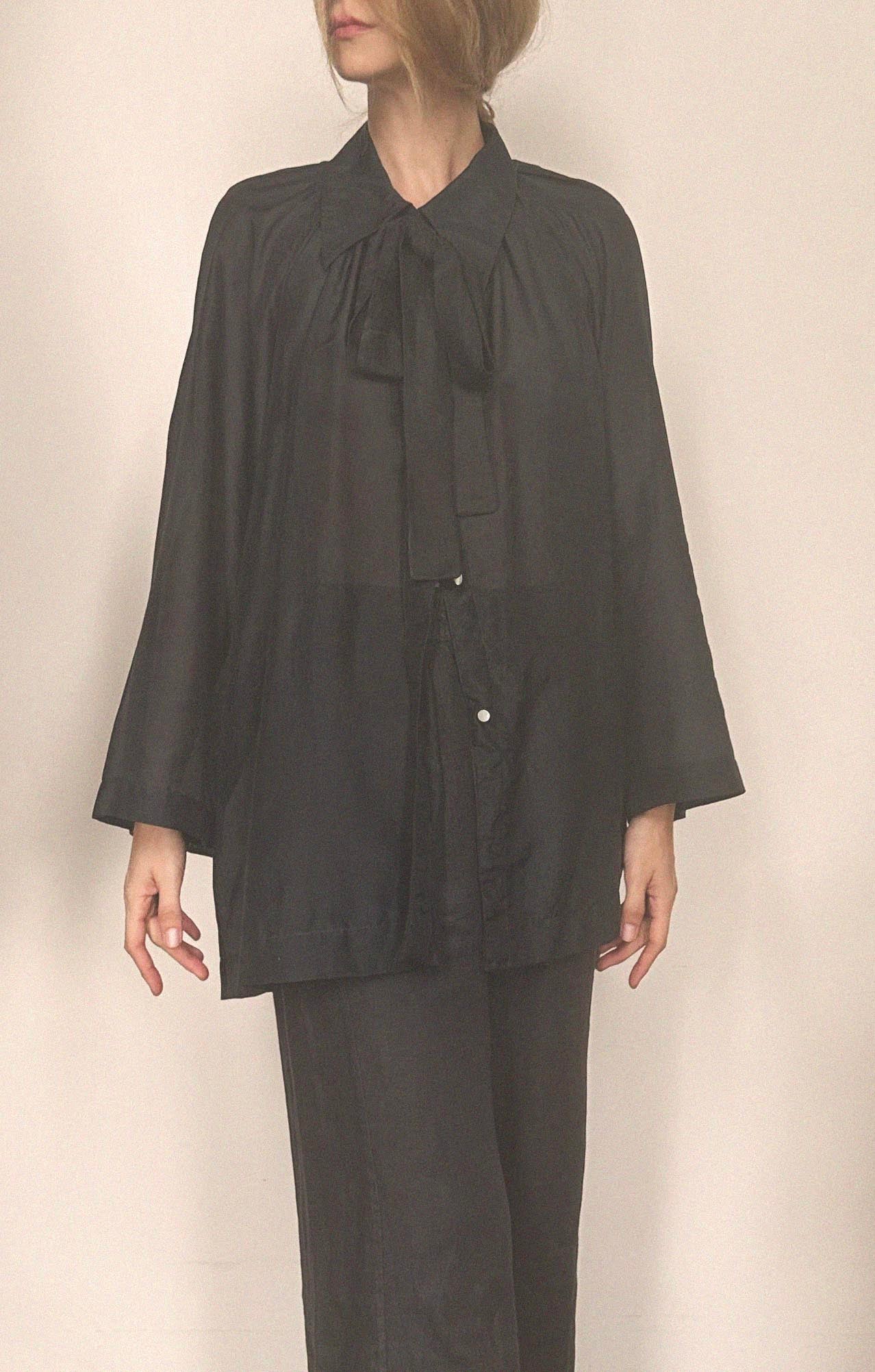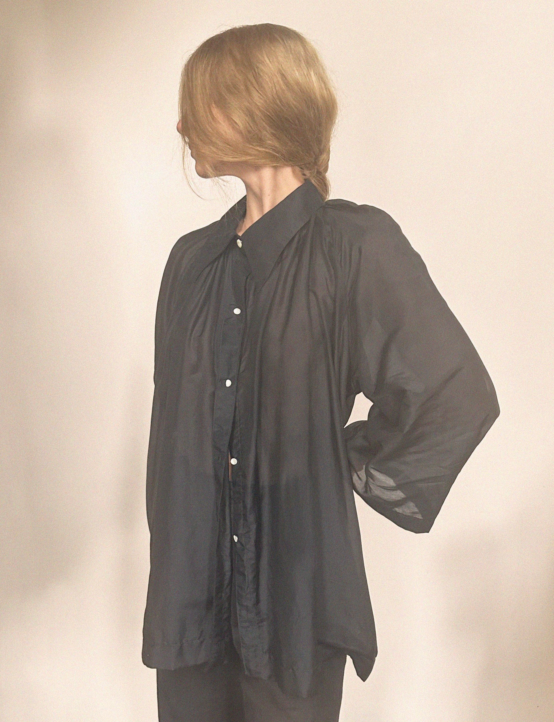 Loose cut, shirt collar, raglan sleeve, old mother-of-pearl buttons glued by hand. Hand wash in cold water or dry clean.