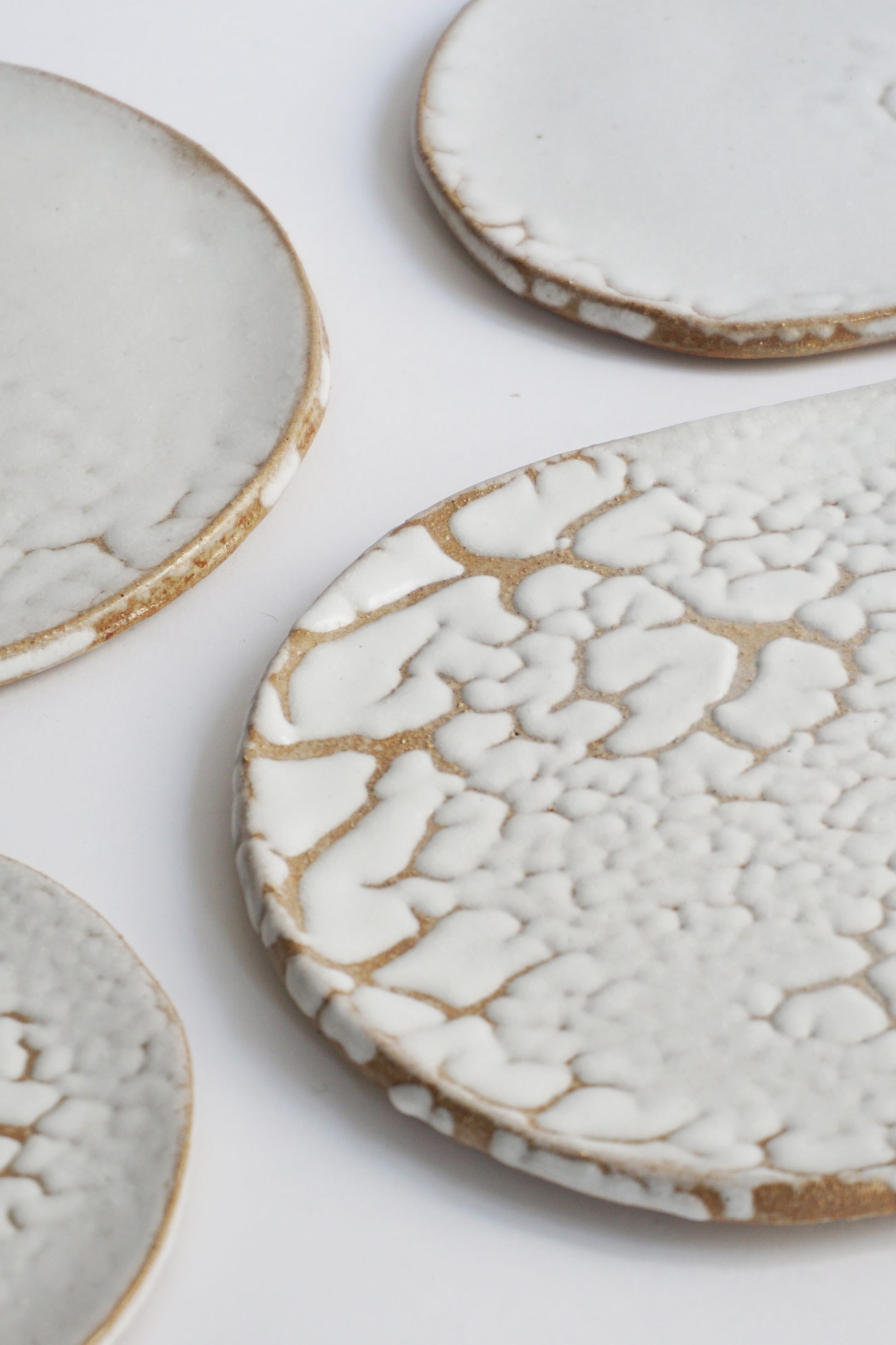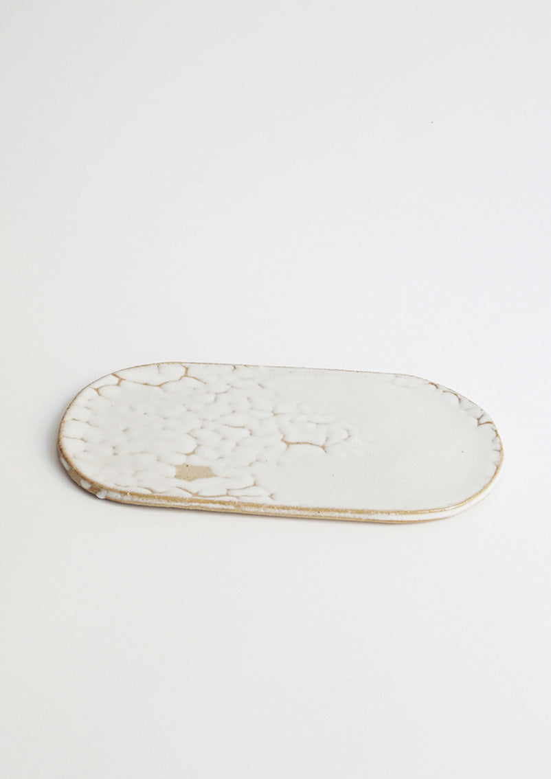 St Amand stoneware tray (Burgundy), satin white enamel with magnesium. The high magnesium content causes the enamel to shrink when cooked, which creates these unique and random patterns.