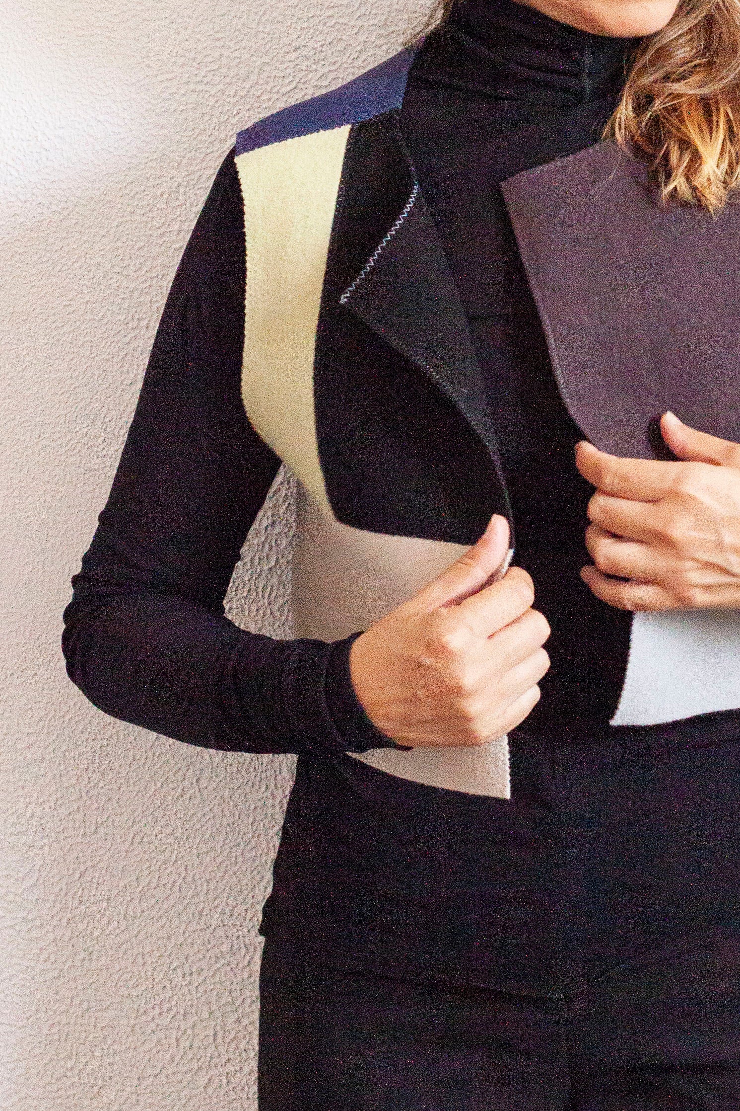 After working for seven years as a designer at Bouroullec studio, Sybille Berger launched her first collection of handmade garments reusing robracks and color charts, from the furniture publisher, Kvadrat. Inspired by sailboat sails, she sews swatches of fabric together with zigzag lines creating simple color blocked vests and jackets. She adds thermo-adhesive reinforcement strips to aesthetically unify the pieces of fabric together. This seam finish also makes her pieces reversible. Berger creates unique ready to wear pieces that give new life to materials that would otherwise be thrown away.