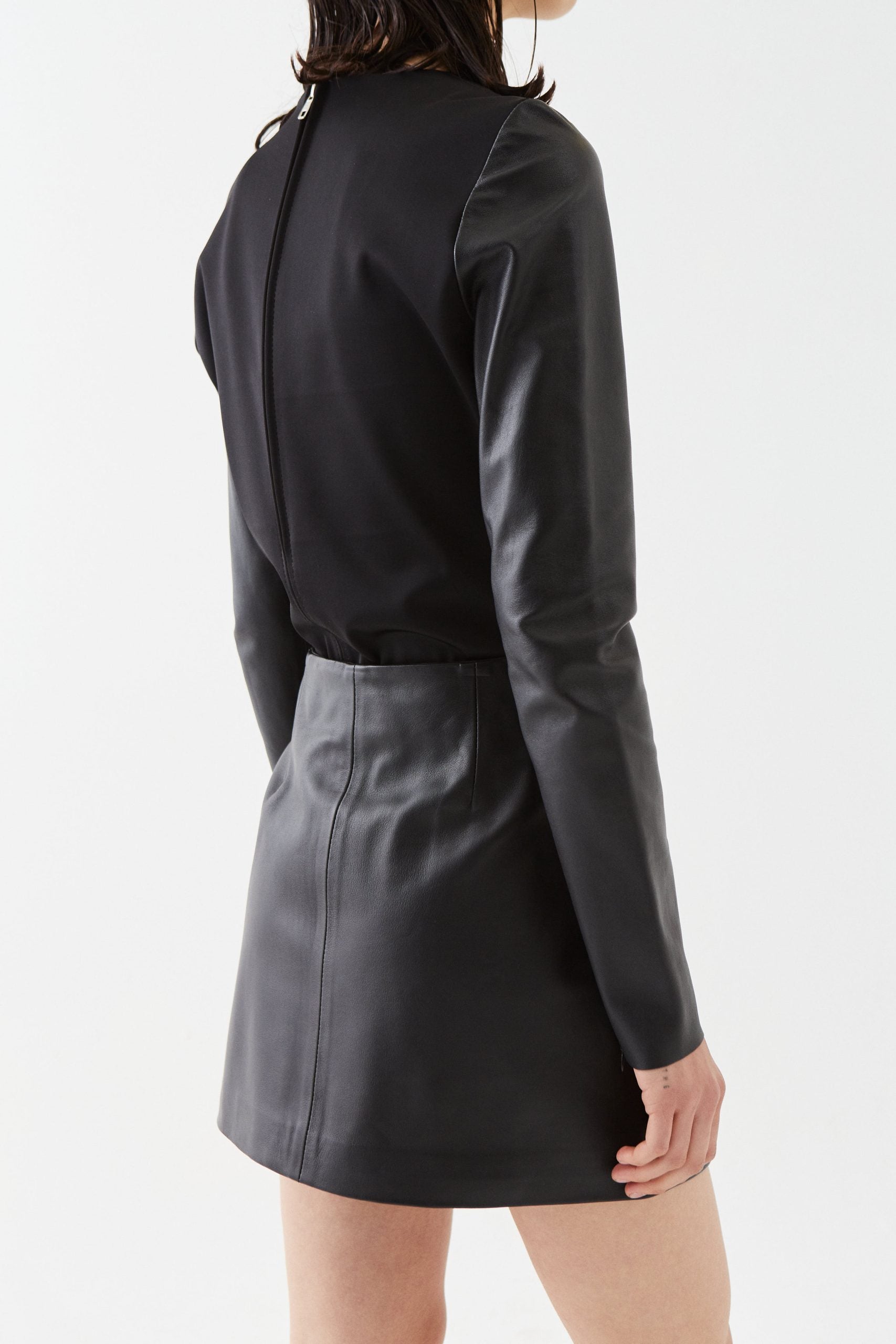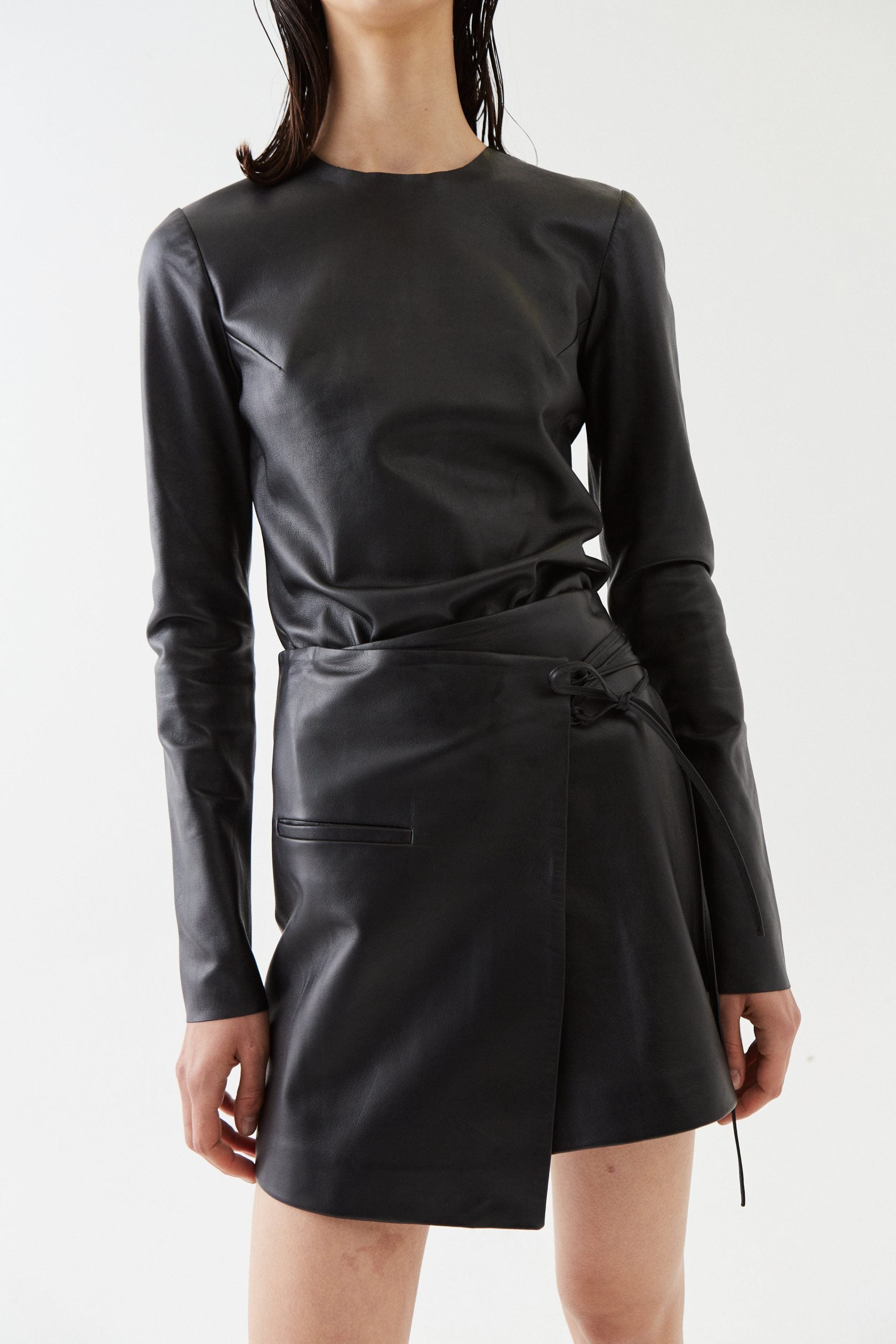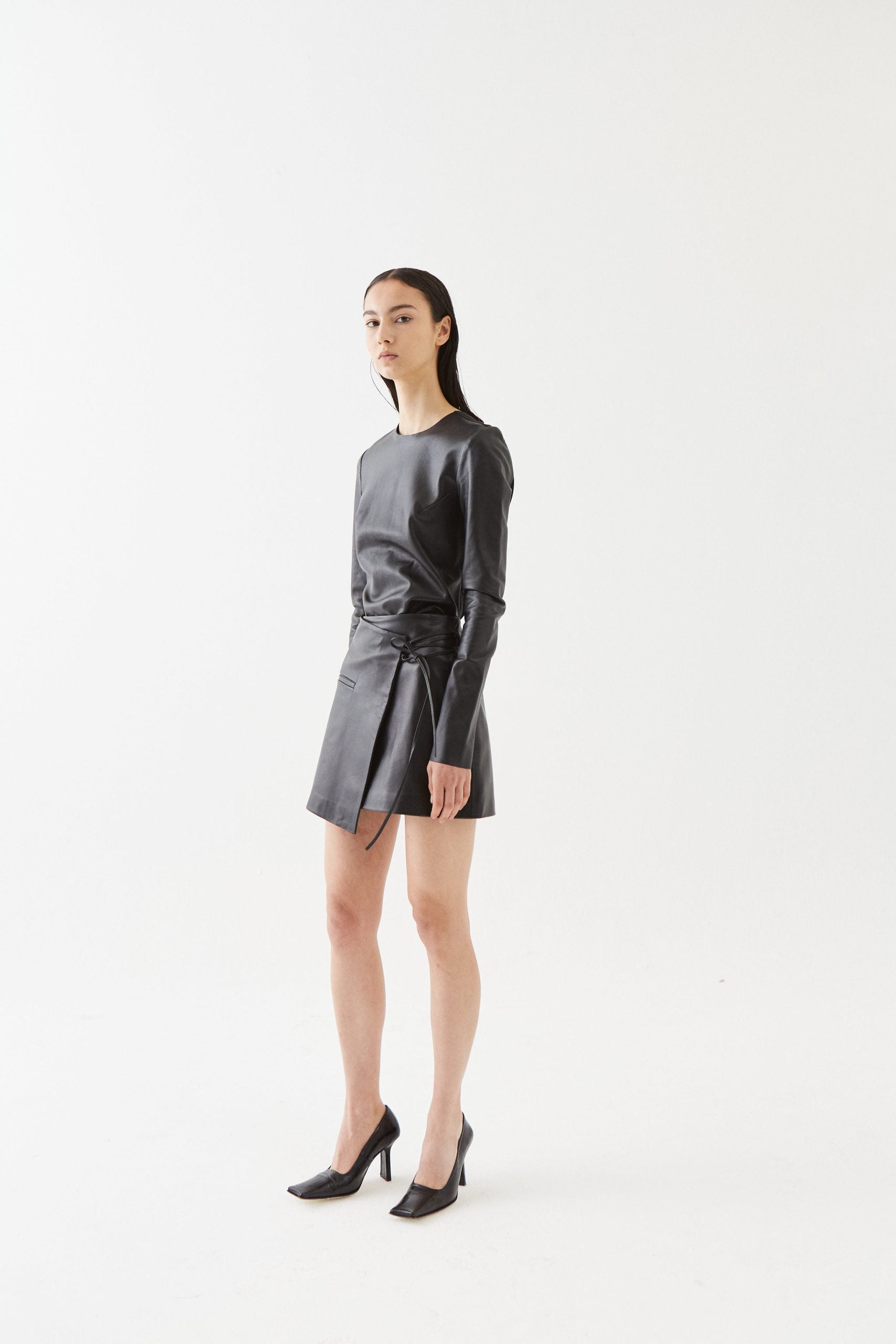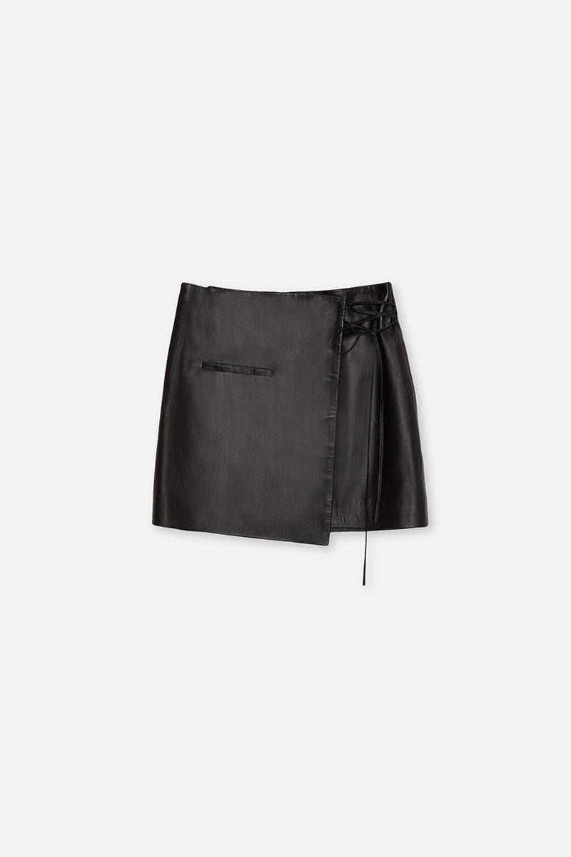 Asymmetrical wrap mini skirt features a welt pocket at the front, ties at the side for adjustment and internal buttons. It is fully lined.