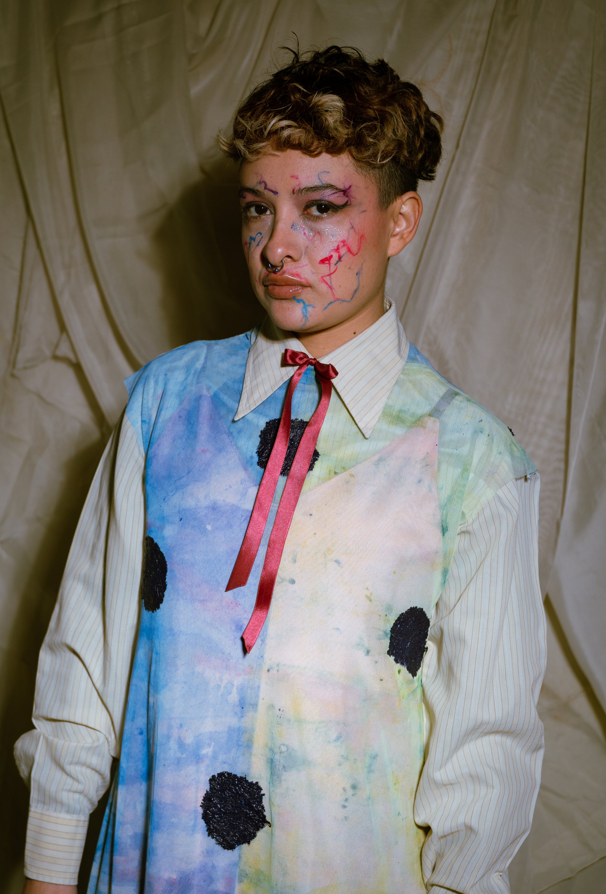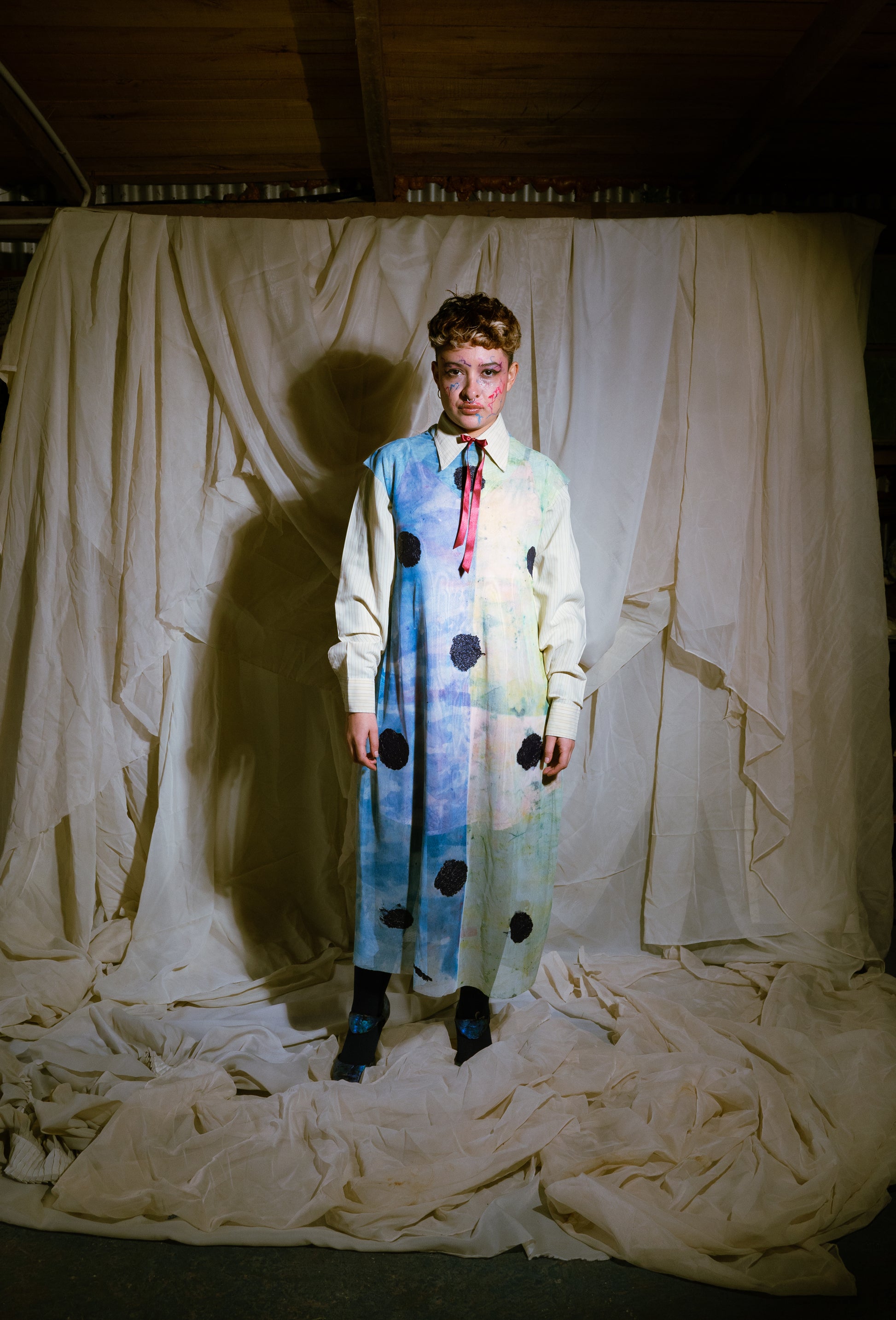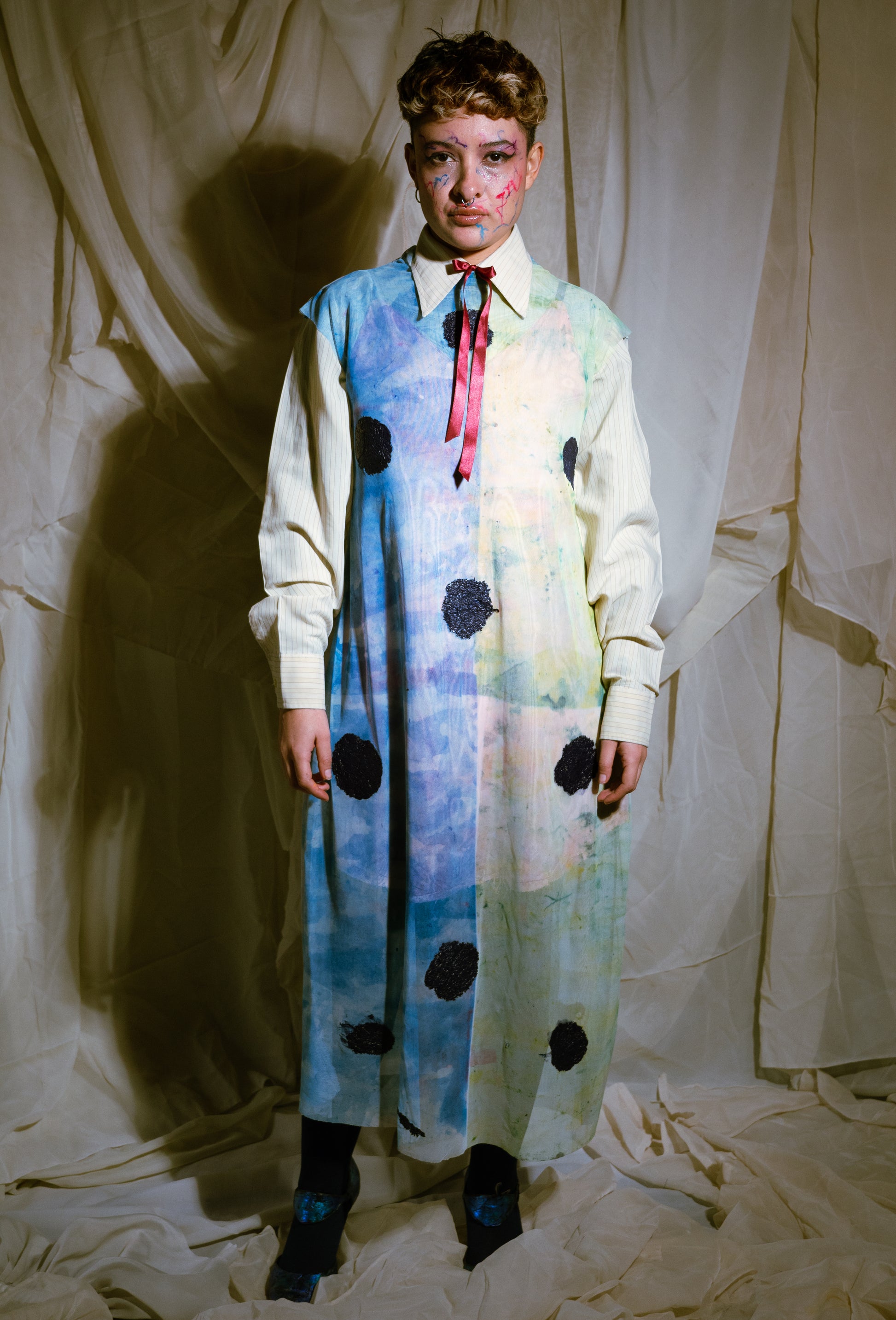 Handmade straight dress in green and cyan and green tones, sublimated and thermofused.