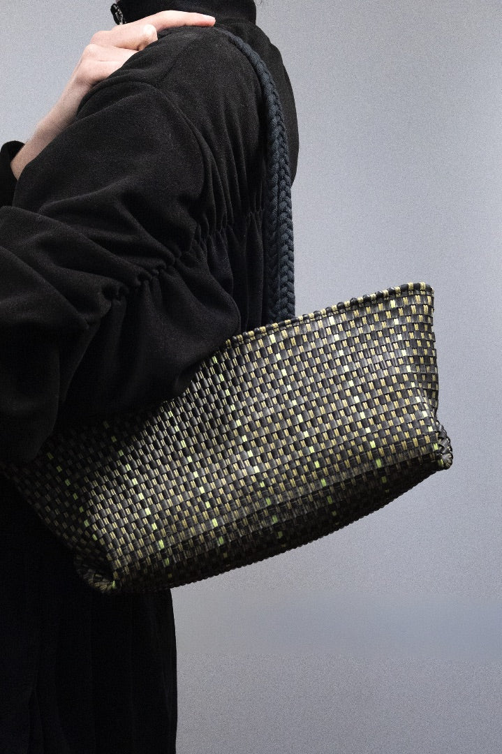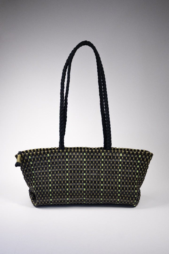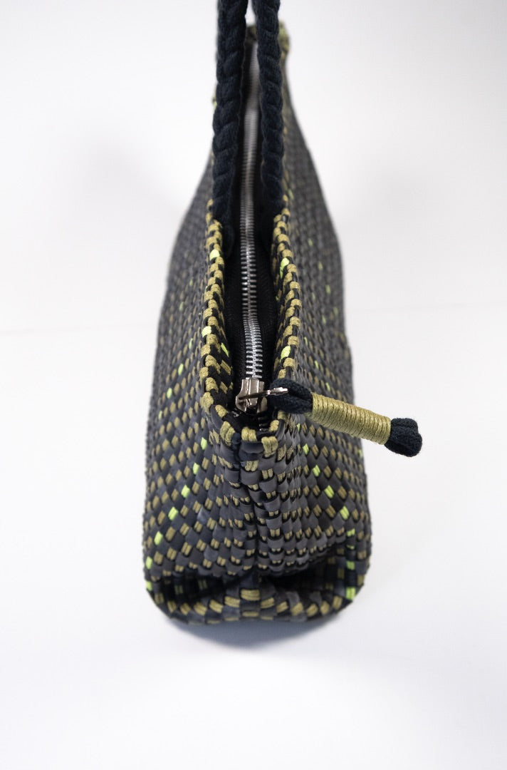 Cartera tejida en bastidor manual con tiras de caucho en la trama e hilos de algodon encerado en la urdimbre. Acceso con cierre metalico YKK, interior forrado en gabardina de algodon y correas de cordon de algodon trenzado.