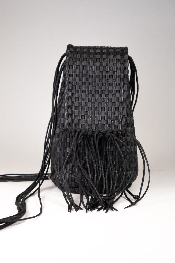 Mini cartera tejida en bastidor manual con tiras de caucho en la trama e hilos de algodon encerado en la urdimbre. Cuenta con una solapa con flecos al frente y cierra frunciendo un cordon de PVC. Tanto su base como su parte superior son de cordon de algodon cosido en zig zag. Su interior esta forrado en gabardina de algodon y su correa puede regularse medinte nudos internos.