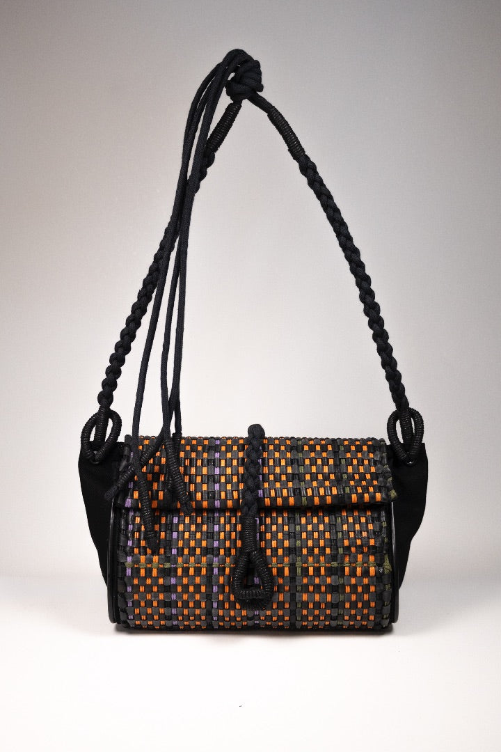 Cartera tejida en bastidor manual con tiras de caucho en la trama e hilos de algodon encerado en la urdimbre. Cuenta con una traba artesanal hecha con cordon e hilo de algodon trenzados y un broche imantado en su interior. Esta forrada en gabardina de algodon y su correa trenzada de cordon de algodon puede regularse para usar al hombro o cruzada.